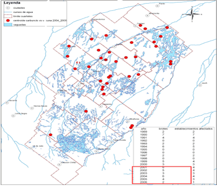 Mapa 1 a) Distribución Porcentual de Carbunclo, en bovinos muertos súbitamente durante los años 1977-2009 (Grafico Nº: 1). Se procesaron un total de 3446 medulocultivos de los cuales 411 (12%) demostraron la presencia de Bacillus anthracis. Durante el 2009 se analizaron 110 muestras resultando positivas 5 (4%) de las mismas. Esta tendencia a la baja de este porcentual se reitera desde el 2007 creyendo que la misma está influenciada por una disminución promedio de las precipitaciones pluviales y bajas temperaturas ambiental.