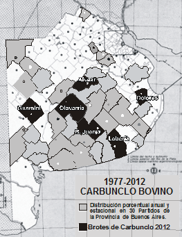 INTRODUCCIONSe cumplieron 35 años de evaluación del Área de Carbunclo Rural de 30 Partidos de la Pcia de Buenos Aires (Mapa 1) un verdadero hito de la Epidemiología Participativa donde el Veterinario, el Productor y el Laboratorio de Diagnostico mediante un sencillo mecanismo de interrelación monitorean el Carbunclo rural en la principal Provincia ganadera del país (1). La distribución porcentual del periodo 1977-2012 fue del 11%, demostrando la endemicidad de esta enfermedad zoonótica. En 1859 Pasteur remitió su vacuna a la Argentina para el control de esta enfermedad, su aplicación obligatoria en los rodeos por la Autoridad competente nunca se reglamento. En la Zona de Alerta y Respuesta del Partido de Azul que evalúa su aplicación voluntaria solo el 14 % vacunan sus rodeos. La producción nacional de vacunas contra el Carbunclo bacteridiano (cepa Sterne) fue de 15.421.135 dosis para este año, Estratégicamente nuestro país tendrá que definir un programa de control del Carbunclo bovino, están todos los elementos necesarios para hacerlo: a) Vacuna de uso Veterinario eficiente y de bajo costo b) Eliminación de cadáveres eficiente que evite la dispersión de las esporas. c) Denuncia obligatoria en el marco de la Ley Nacional Nº: 3959 y su plena aplicación. 1- AREA DE EVALUACION DE CARBUNCLO RURALEsta importante área ganadera de la Provincia de Buenos Aires, constituida por 30 Partidos del interior productivo, constituyen el 32% de la superficie ganadera y donde está radicado el 30 % del rodeo provincial. En dicha superficie se encuentra la llanura anegable "Cuenca del Río Salado", un relieve extremadamente llano con un predominio de suelos alcalinos sódicos, con materia orgánica variable con formación de charcos y lagunas que hacen que componentes del paisaje favorezcan la aparición de brotes de Carbunclo bovino en la "Pampa Deprimida" (3). Distribución Porcentual anual: En el Transcurso del 2012(Grafico1) se evaluaron 134 huesos largos de los cuales 8 resultaron positivos; determinando para tal periodo una Distribución Porcentual anual del 6%.Este mismo parámetro en el periodo 1977-2012 con un total de 3789 muestras de los cuales 436 resultaron aislamientos de Bacillus anthracis, definiendo un promedio acumulado en 35 años del 11% de bovinos muertos súbitamente por tal etiología. La evaluación de los quinquenios en estos 35 años, demuestra el promedio anual de 12 aislamientos de Bacillus anthracis por años. Los menos productivos fueron 1977-81 con 5 y el último evaluado 2007-11 con 6.Los mayor cantidad de aislamientos ocurrieron en: 1987-91 y 2002-06 ambos con 19. El año1989 con 24 aislamientos y el 2001 con 25 fueron los años más destacados. Será para futuras evaluaciones cruzar esta información con datos climatológicos: Porcentajes de precipitaciones de semestres calidos y Fríos / Duración de los Bioperiodos de 15ºC para contraponerlo con los datos de brotes existentes de esta enfermedad telúrica, donde las esporas en el suelo juegan un papel destacado en el mantenimiento de la enfermedad carbunclosa. Los Partidos del Área de Evaluación involucrados en el 2012, con focos de carbunclo bovinos fueron: Guamini, Olavarria, Lobería, Juárez, Dolores y Gral. Alvear (Mapa 1)