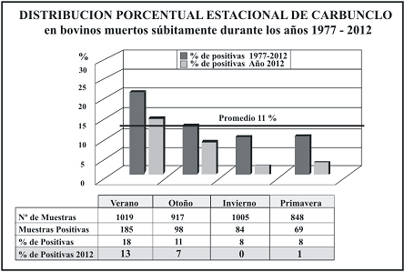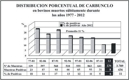 SITUACION DEL CARBUNCLO RURAL EN LA ARGENTINA - 2012Dr. Ramón Pedro Noseda (*) RESUMENDesde el 2004 se presenta a la consideración pública este tipo de informe con el fin de demostrar fehacientemente la endemicidad del Carbunclo rural en la Argentina. Su Área de Evaluación cumplió 35 años y esta conformada por 30 Partidos de la Pcia de Buenos Aires, demostrando una distribución porcentual anual del periodo 1977-2012 del 11%, con variaciones quinquenales máximas del 18% (1977-81) a mínimas del 5% (2007-11). La distribución porcentual estacional ha demostrado que el verano, con el 18% y el otoño con el 11% son estaciones calientes más productivas de Carbunclo bovino. El invierno-primavera por ser mas frías, ambas demuestran un 8% de animales muertos súbitamente por causa del Bacillus anthracis. En esta Área se aislaron 436 cepas de esta bacteria, un promedio de 12 aislamientos anuales; Justificando que el 49% de los Partidos rurales de la Provincia de Bs. As. hayan padecido brotes de Carbunclo Bovino. La Zona de Alerta y Respuesta ante epidemia de ocurrencia natural, accidental o deliberada de B. anthracis; constituida en el Partido de Azul se encuentran Geo referenciados (GIS) 66 focos de Carbunclo bovino (1988-2012). Esta Zona demostró una exigua vacunación contra el Carbunclo bacteridiano del 14%, coincidiendo con una producción nacional anual de vacuna de poco mas de 15 millones de dosis. A fin de monitorear en forma comparativa otras regiones, se invito a participar a otros Laboratorios de Diagnósticos Veterinarios (Punto 5) que demostraron tener para el 2012 un 13% de Distribución Porcentual Anual. Los casos de Carbunclo Dérmico Humano fueron 10, provenientes de 6 Provincias. La situación epidemiológica del Carbunclo Rural en Argentina 1977-2012, no ha variado, demostrando su endemicidad en el país, solo justificada por la negligencia humana. SUMMARY This kind of report has been submitted to public opinion since 2004 with the purpose of clearly defining the endemic feature of Rural Carbuncle in Argentina. Its Assessment area is now 35 years old and it comprises 30 Districts of the Province of Buenos Aires where there was an annual percentile distribution of 11% during the term 1977-2012 with maximum quinquennial variations ranging from 18% (1977-1981) to minimum of 5% (2007-2011). Seasonal percentile distribution has proven that 18% in Summer and 11% in Autumn are hot seasons when Bovine Carbuncle turns out to be more productive.