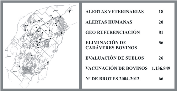 Gráfico 2 2 - ZONA DE ALERTA Y RESPUESTA ANTE EPIDEMIA DE OCURRENCIA NATURAL, ACCIDENTAL O DELIBERADA DE B. anthracis - Azul Pcia. de Bs. AsLa Zona de Alerta y Respuesta anticipada del Carbunclo Rural surgió en el 2004 por Decreto del Poder Ejecutivo Municipal del Partido de Azul Nº: 66105 integrado por 9 Instituciones relacionadas con la Salud Publica (Secretaria de Salud Publica Municipal - Circulo de Médicos Veterinarios - Laboratorio Azul Diagnostico - Departamento de Zoonosis Rurales del Ministerio de Salud de la Pcia. de Buenos Aires (5) - INTA Cuenca del Salado - Facultad de Agronomía: Cátedra de Edafología - SENASA - FUNDAZUL - Región Sanitaria IX-Ministerio de Salud del Pcia. de Buenos Aires),( 5)buscando hacer la detección temprana, la respuesta rápida y el control de la enfermedad en su lugar de origen. La información compartida entre los distintos efectores de salud, favorece un análisis epidemiológico de control de focos animales y casos humanos, por actuación de Veterinarios y Médicos actuantes en forma interrelacionada. Habiéndose registrado las siguientes intervenciones (Mapa-Cuadro 2).